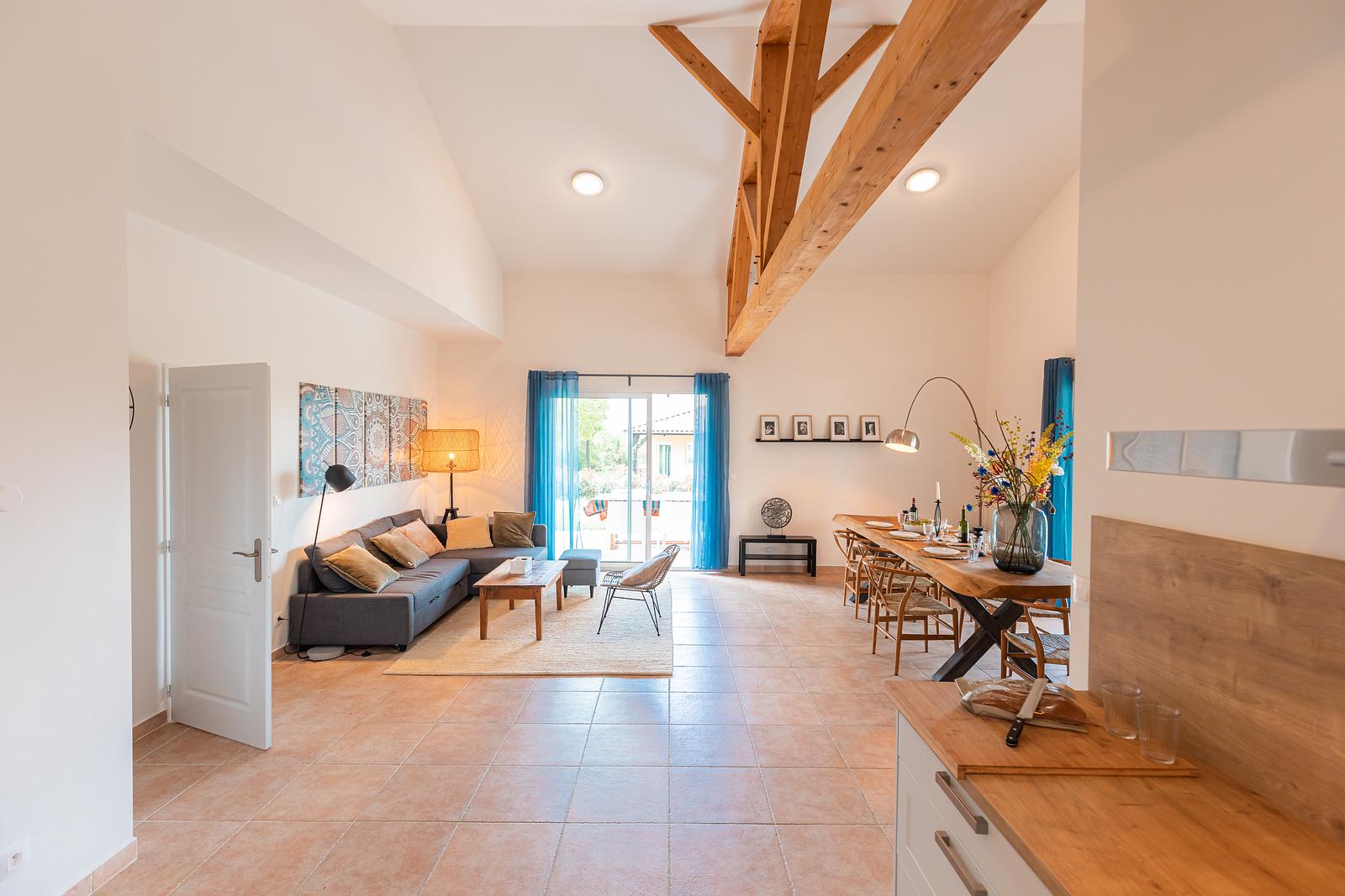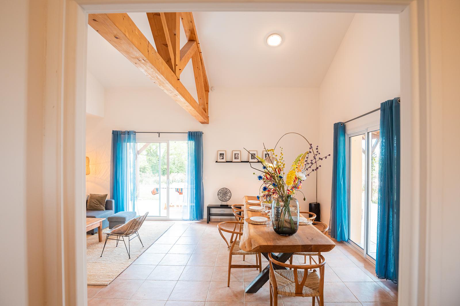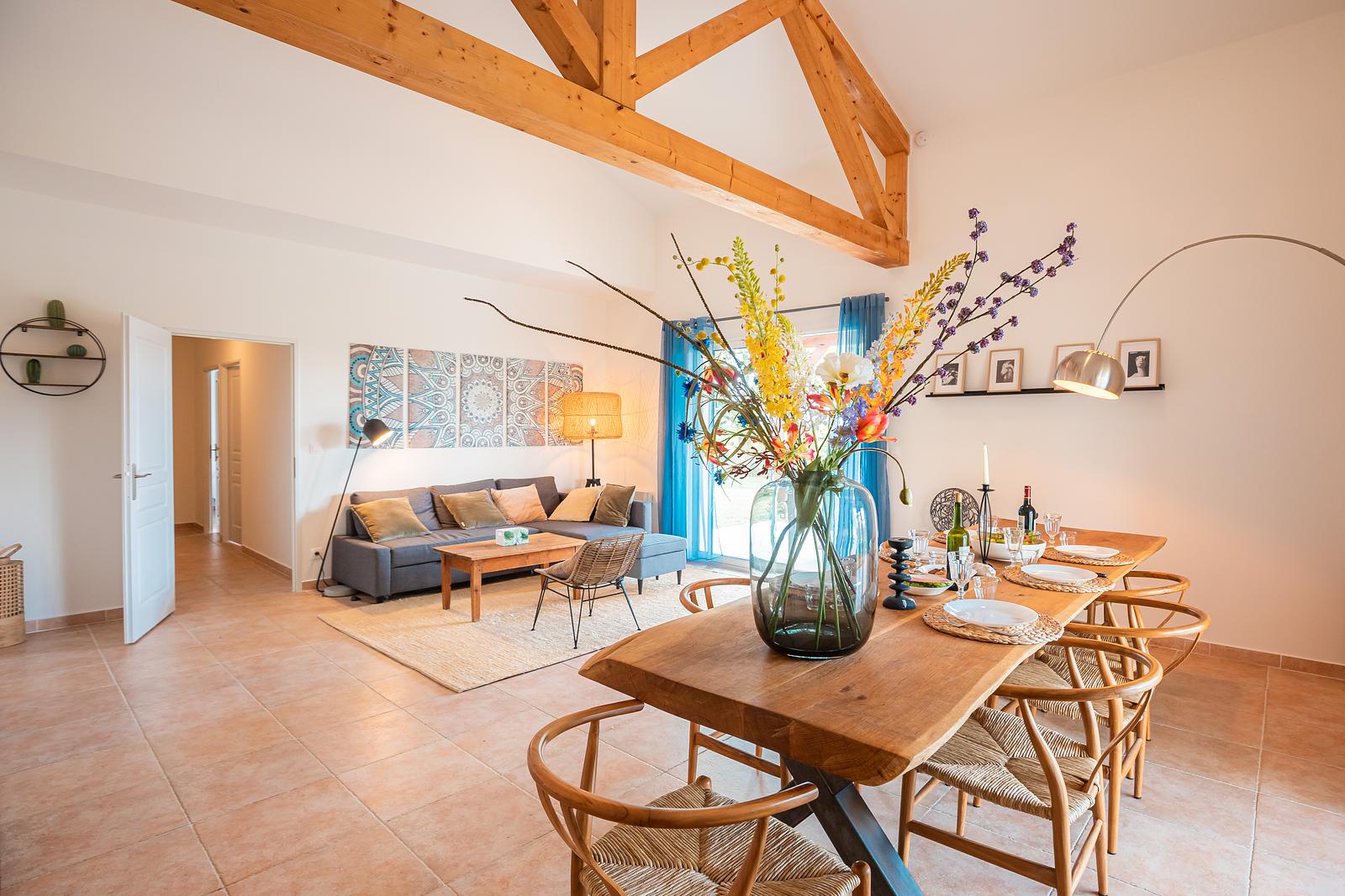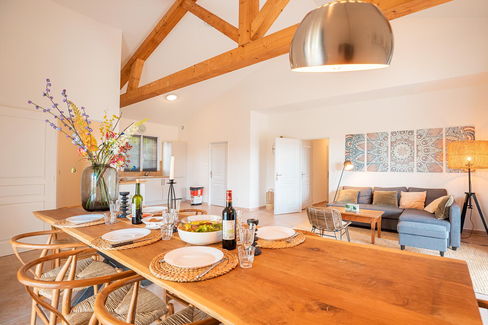 The 120 m² villa has a large garden, a spacious terrace with a dining and BBQ area and offers peace and tranquillity amidst the greenery of the French countryside. With 3 bedrooms and 2 bathrooms, this villa comfortably accommodates up to 6 people. Our luxury villa is beautifully furnished and equipped with all modern conveniences to ensure you have a successful holiday, including a bookcase full of wonderful books. The real eye-catcher in the living room is the beautiful wooden table with 6 chairs. The abundance of light coming in through the sliding doors creates a cosy atmosphere. The villa also has a large dining table with 6 chairs and a seating area on the outdoor terrace. The villa has a barbecue that can be used during your stay. Our villa is surrounded by a large garden with garden furniture. We also have a fire pit where you can sit around the fire with a glass of wine until the late hours.