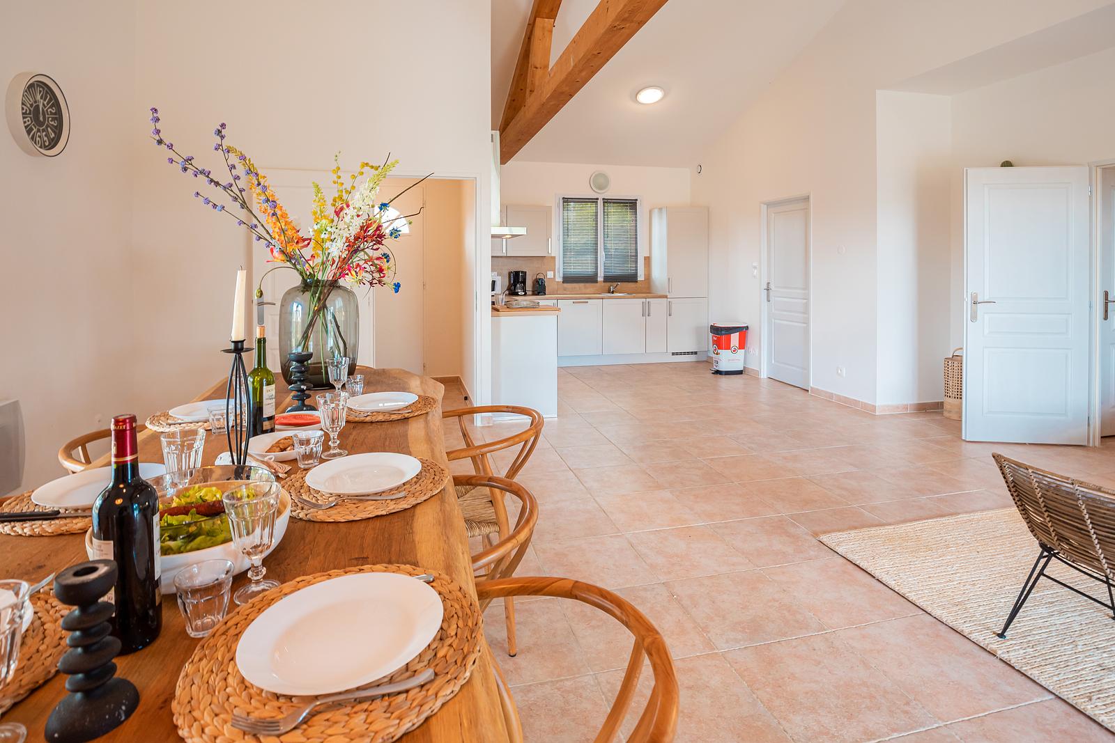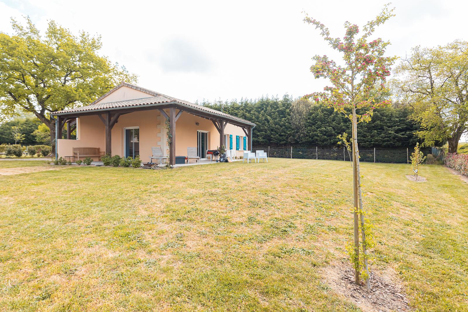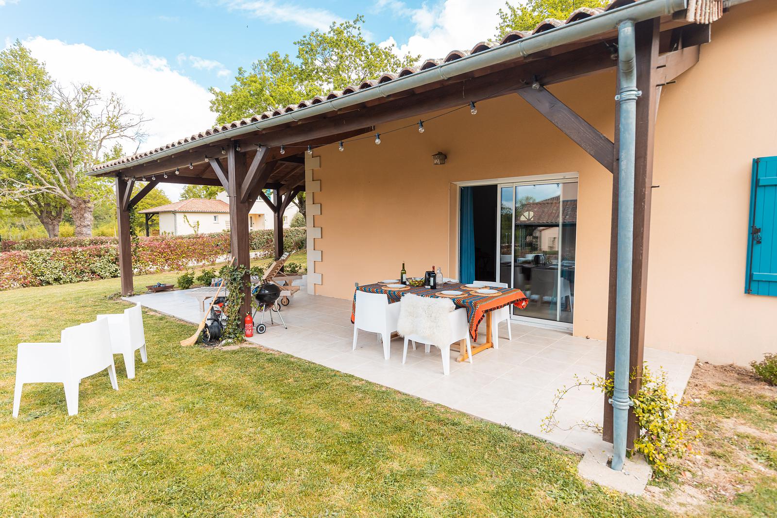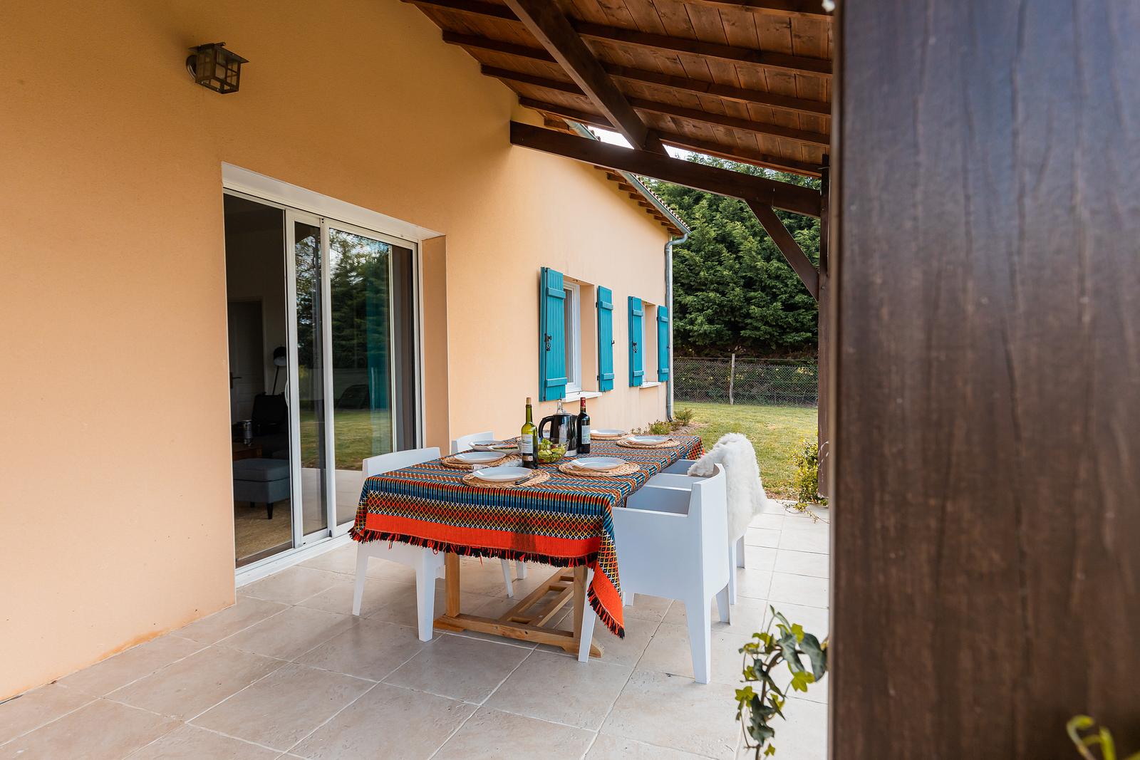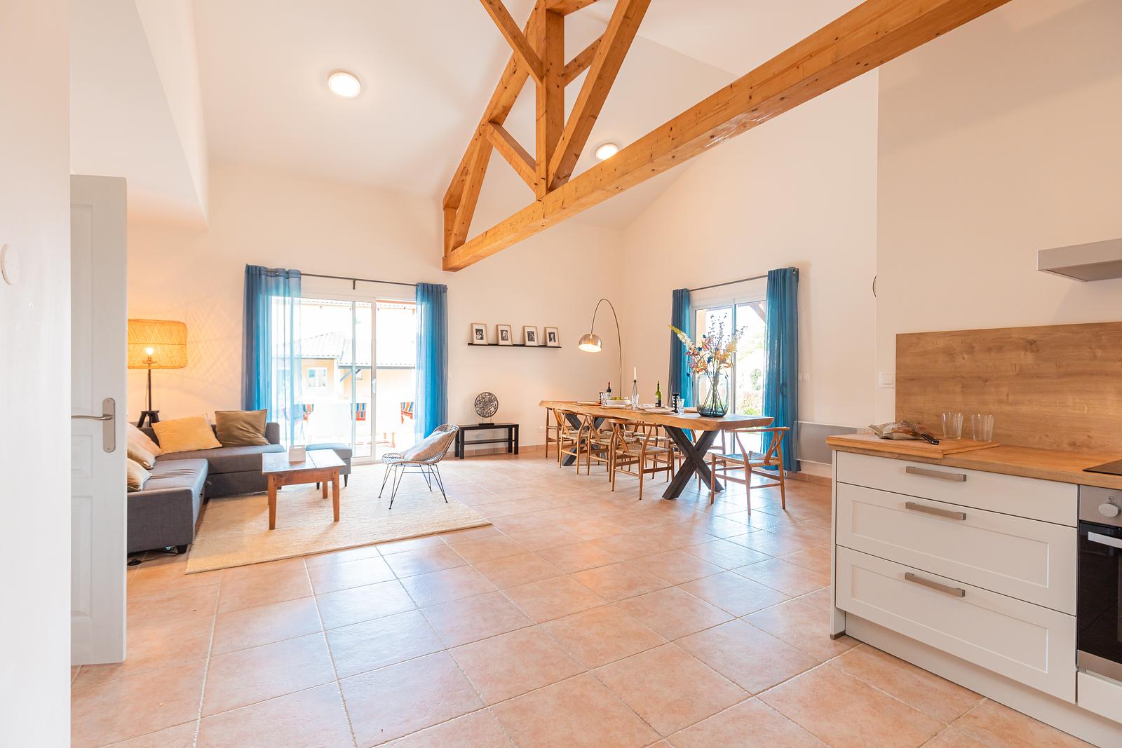 The 120 m² villa has a large garden, a spacious terrace with a dining and BBQ area and offers peace and tranquillity amidst the greenery of the French countryside. With 3 bedrooms and 2 bathrooms, this villa comfortably accommodates up to 6 people. Our luxury villa is beautifully furnished and equipped with all modern conveniences to ensure you have a successful holiday, including a bookcase full of wonderful books. The real eye-catcher in the living room is the beautiful wooden table with 6 chairs. The abundance of light coming in through the sliding doors creates a cosy atmosphere. The villa also has a large dining table with 6 chairs and a seating area on the outdoor terrace. The villa has a barbecue that can be used during your stay. Our villa is surrounded by a large garden with garden furniture. We also have a fire pit where you can sit around the fire with a glass of wine until the late hours.