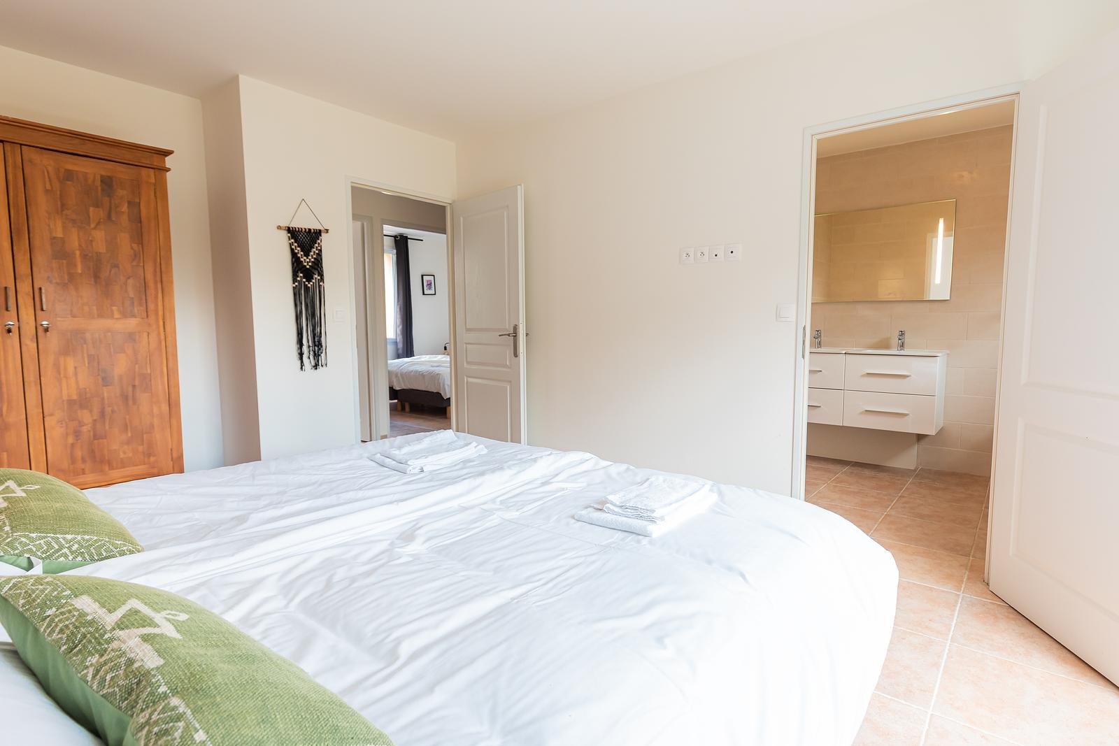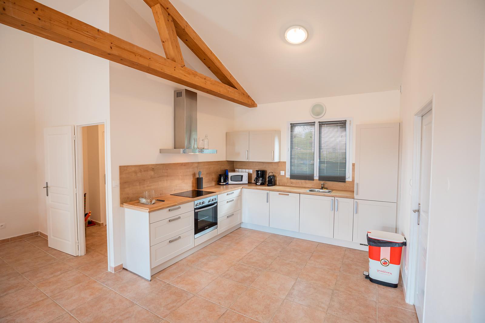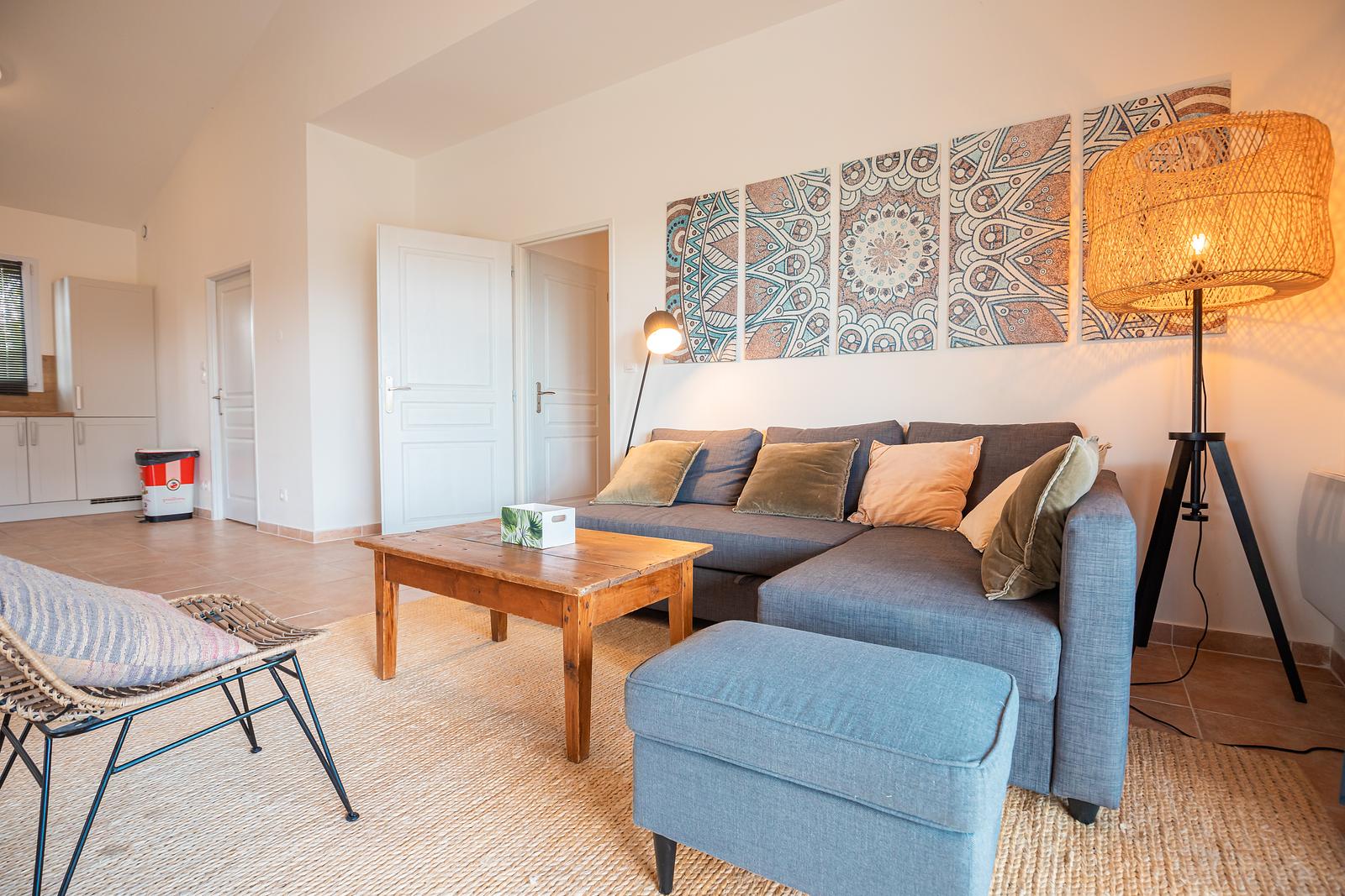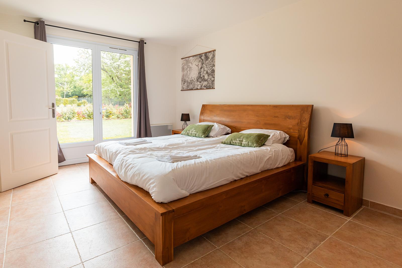 The 120 m² villa has a large garden, a spacious terrace with a dining and BBQ area and offers peace and tranquillity amidst the greenery of the French countryside. With 3 bedrooms and 2 bathrooms, this villa comfortably accommodates up to 6 people. Our luxury villa is beautifully furnished and equipped with all modern conveniences to ensure you have a successful holiday, including a bookcase full of wonderful books. The real eye-catcher in the living room is the beautiful wooden table with 6 chairs. The abundance of light coming in through the sliding doors creates a cosy atmosphere. The villa also has a large dining table with 6 chairs and a seating area on the outdoor terrace. The villa has a barbecue that can be used during your stay. Our villa is surrounded by a large garden with garden furniture. We also have a fire pit where you can sit around the fire with a glass of wine until the late hours.